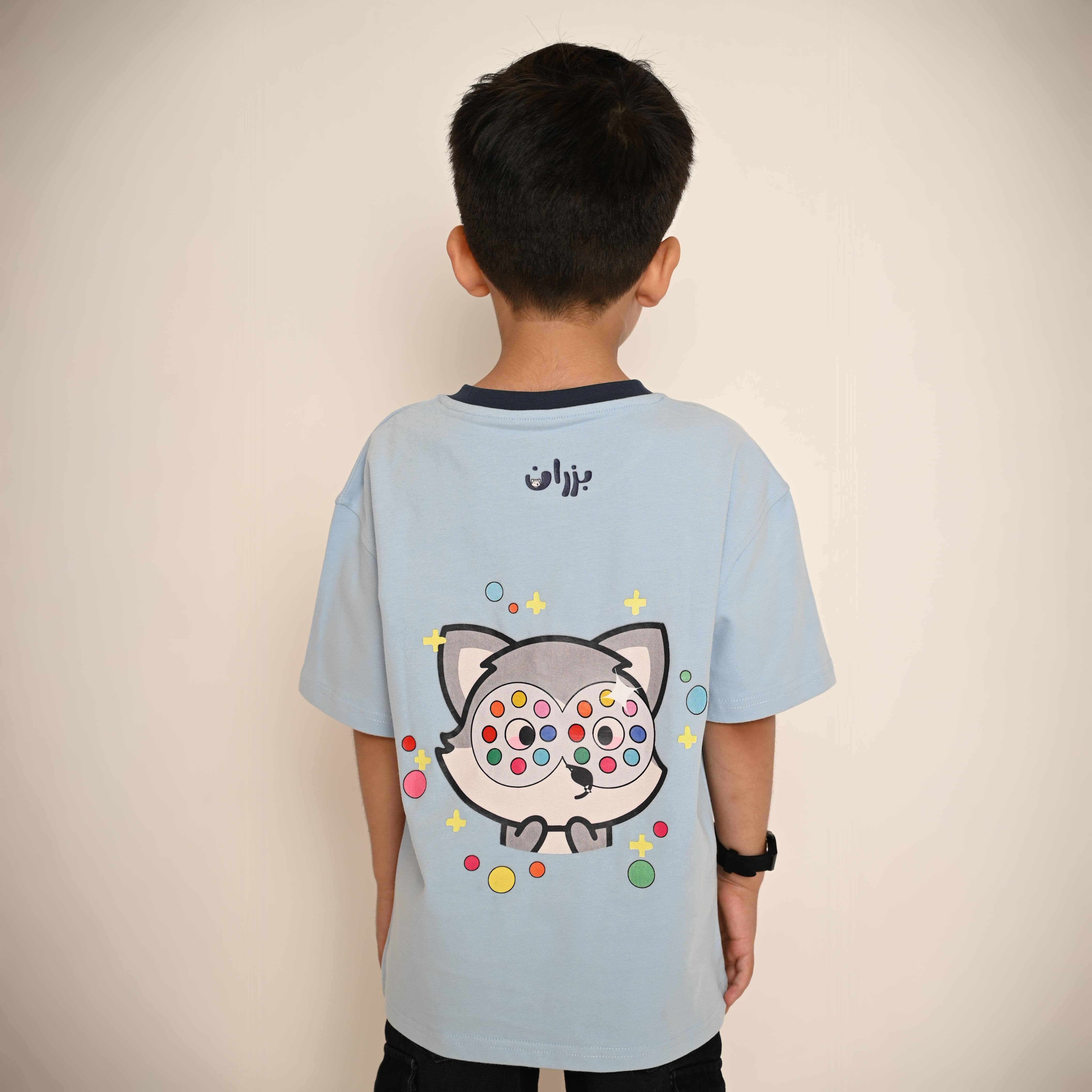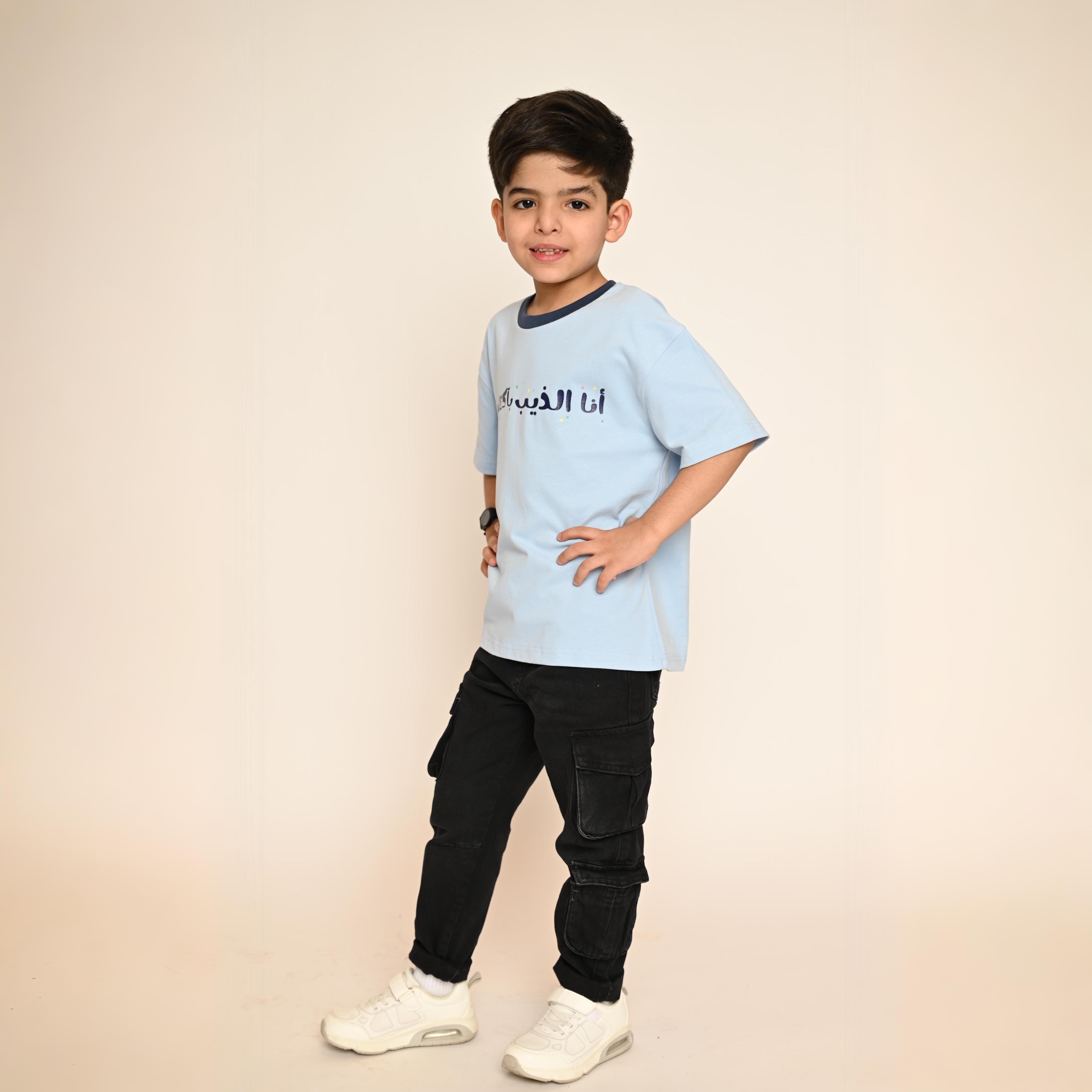 امنح طفلك إطلالة فريدة مستوحاة من التراث الشعبي مع تيشيرت أنا الذيب بآكلكم بلونه السماوي الأنيق وتصميمه المستلهم من اللعبة الشعبية المعروفة.
