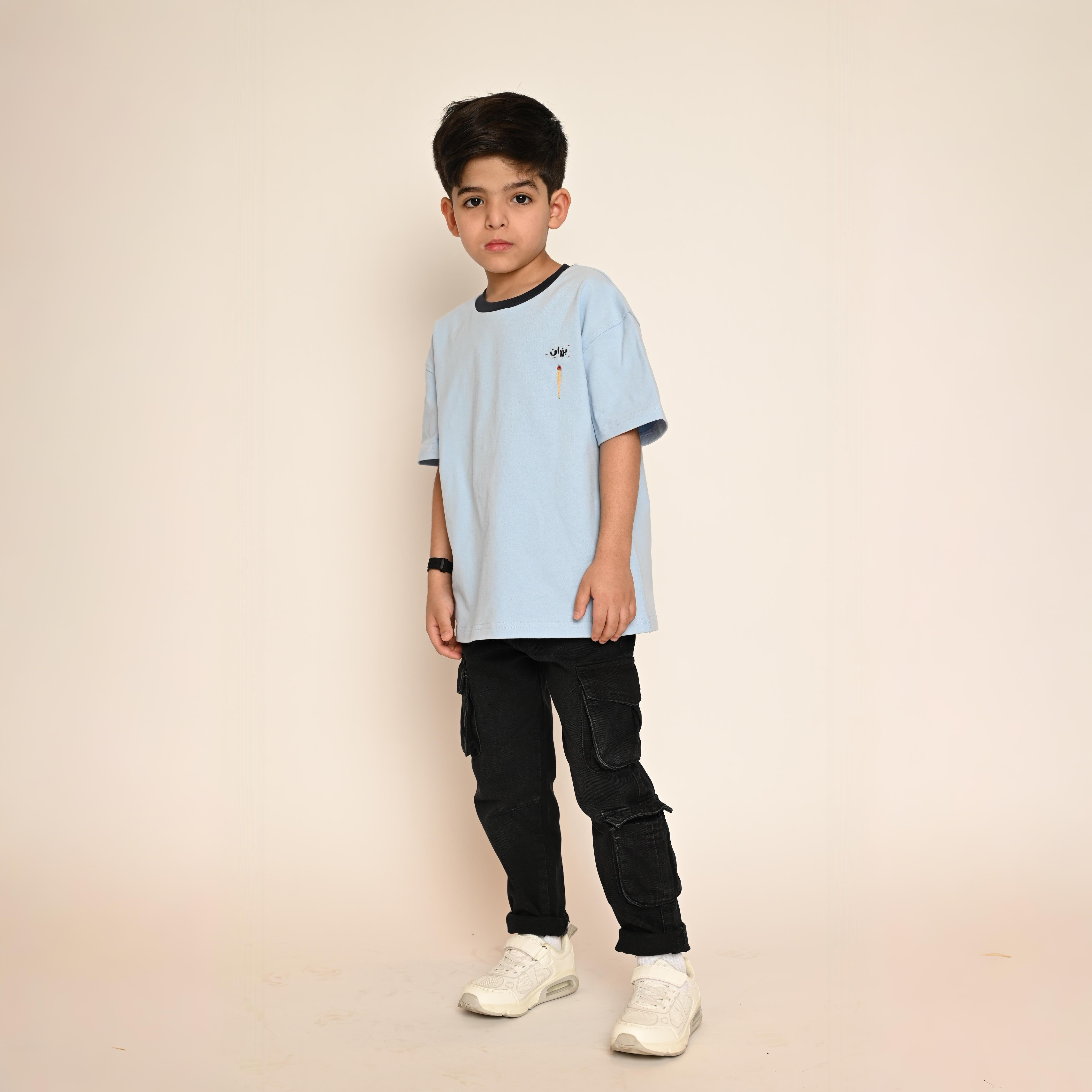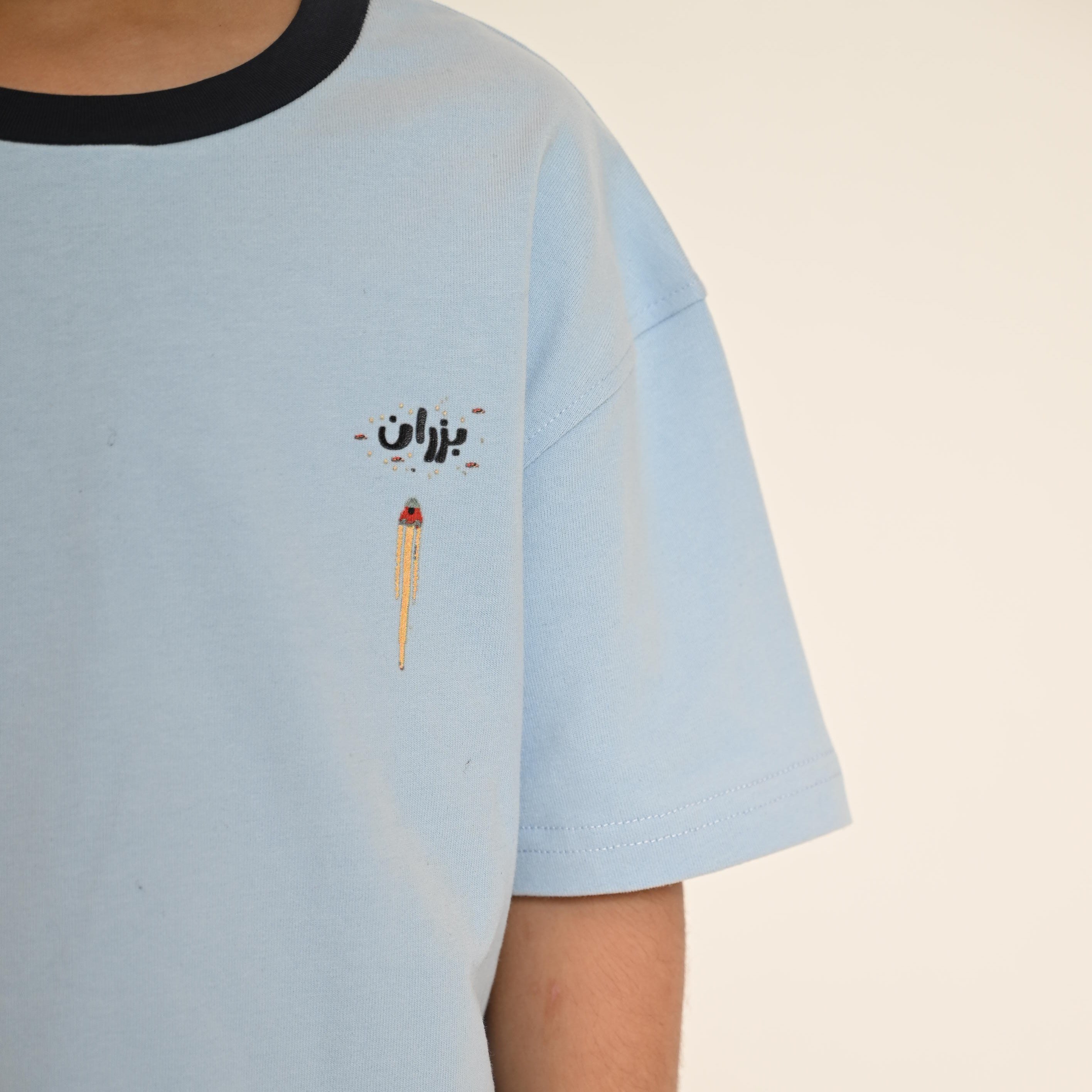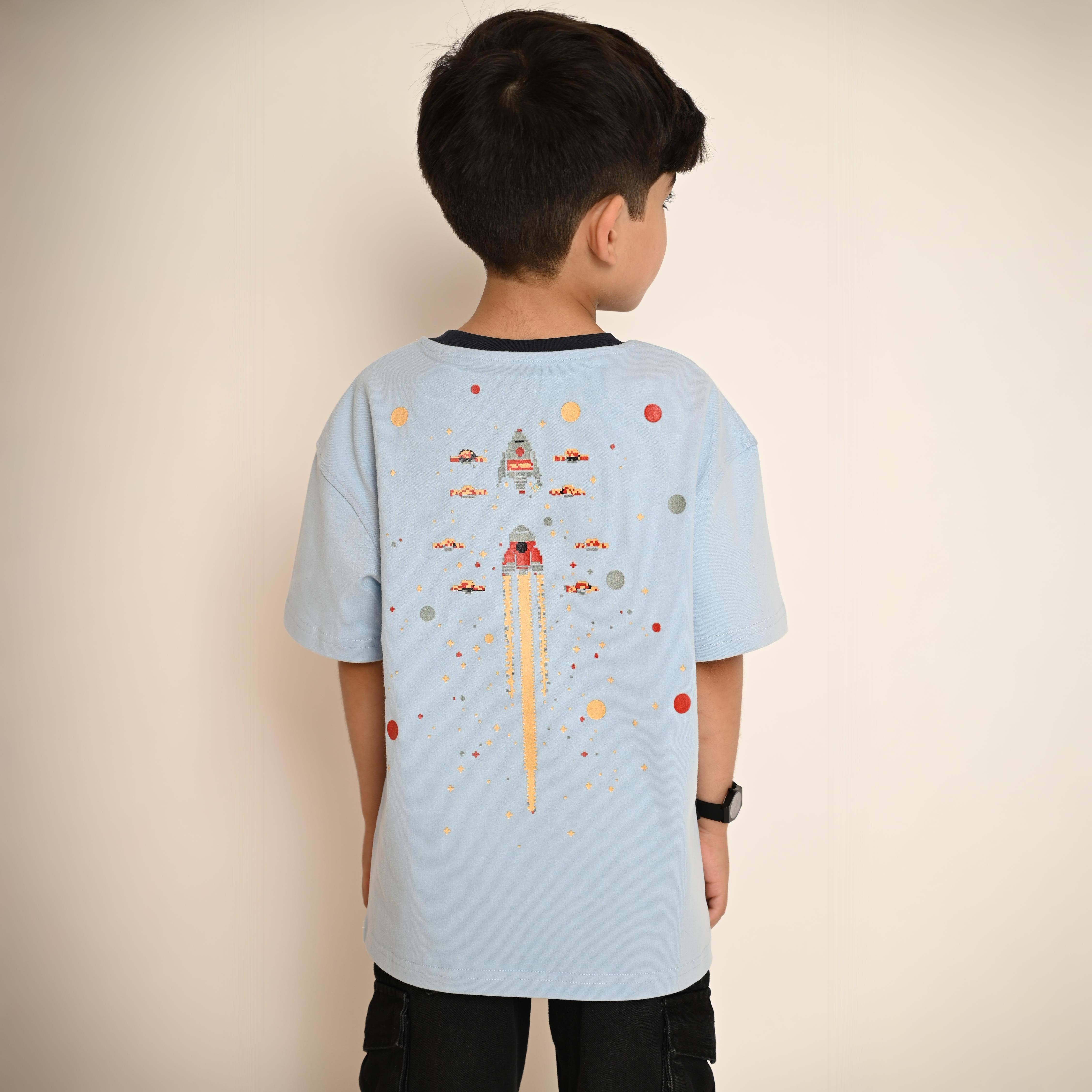 أعد لطفلك لمسة من الماضي الجميل مع تيشيرت الأتاري بلونه السماوي وتصميمه المستوحى من أشرطة الألعاب القديمة في الثمانينات.