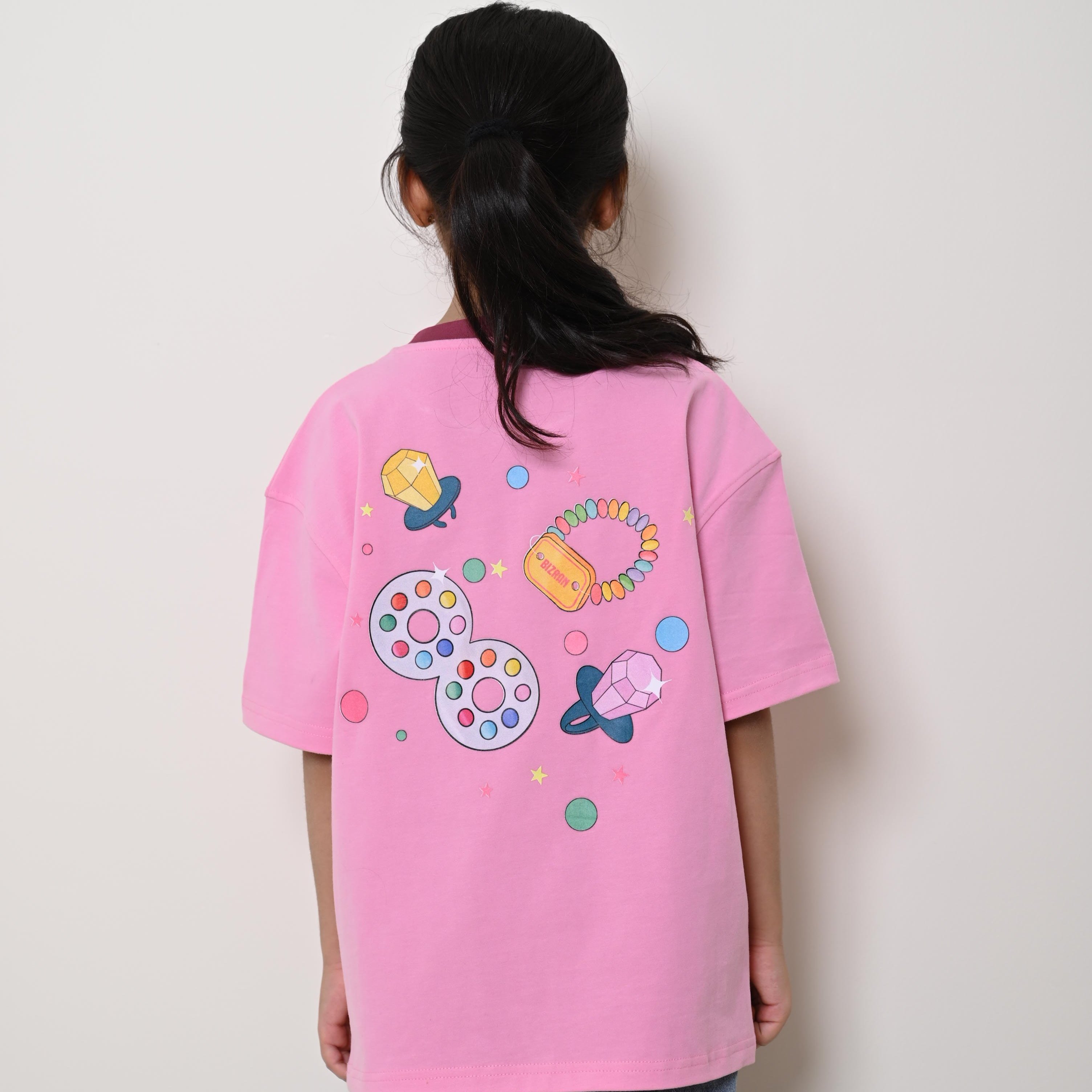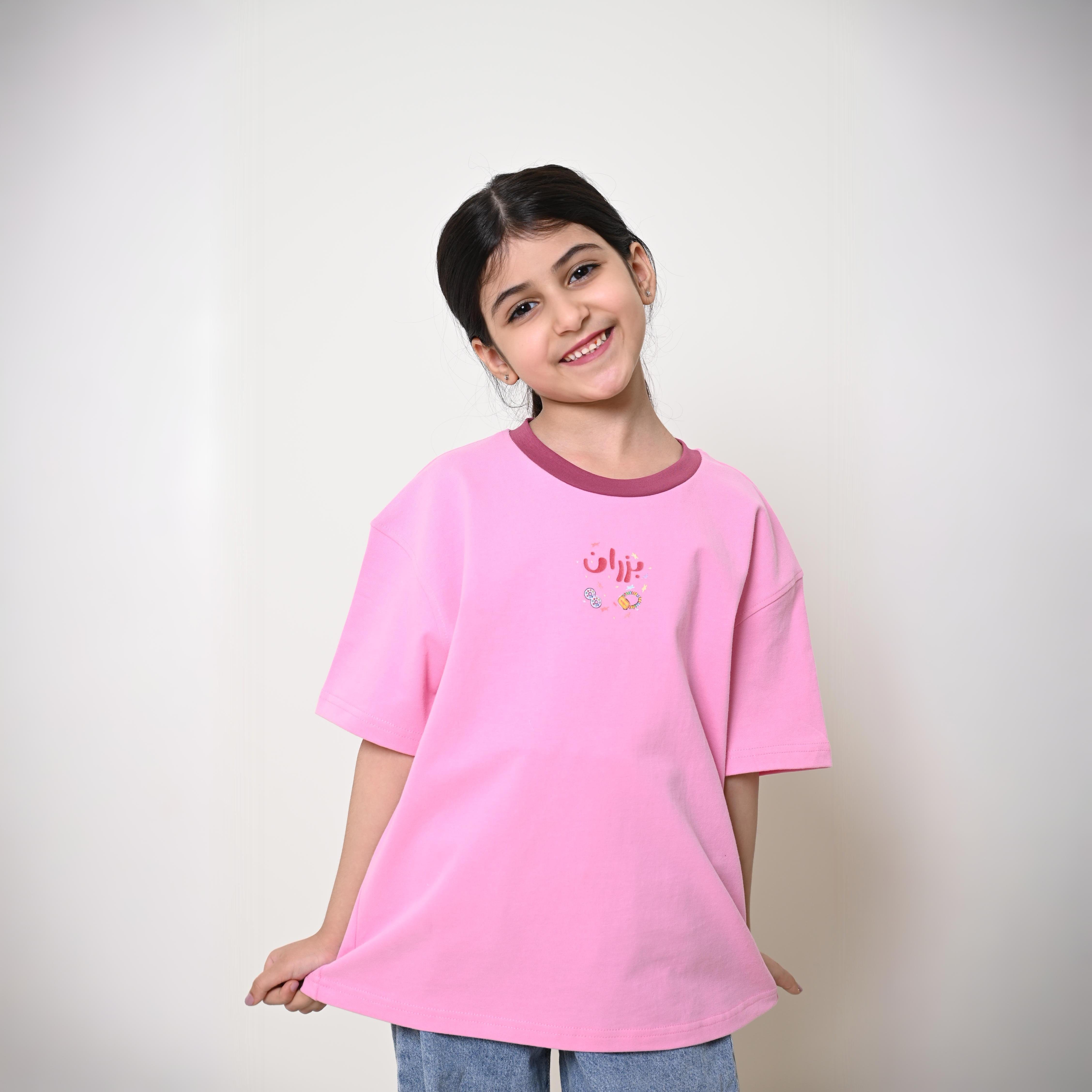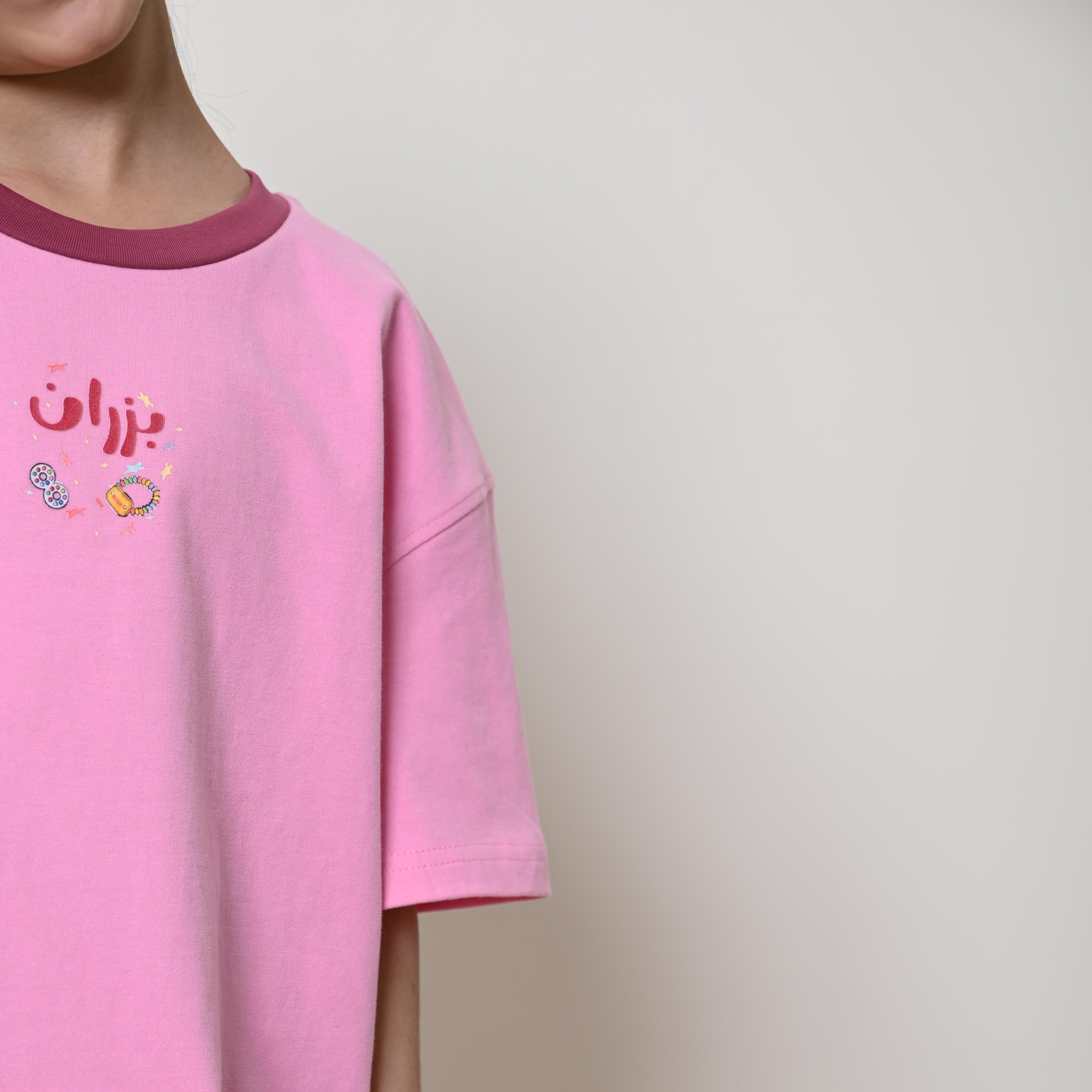 أعيدي لطفلتك لمسة من ذكريات “الطيبين” مع تيشيرت حلويات كشخة الطيبين بلونه الوردي الناعم وتصميمه المميز المستوحى من الحلويات القديمة مثل الساعة، النظارة، والخاتم.