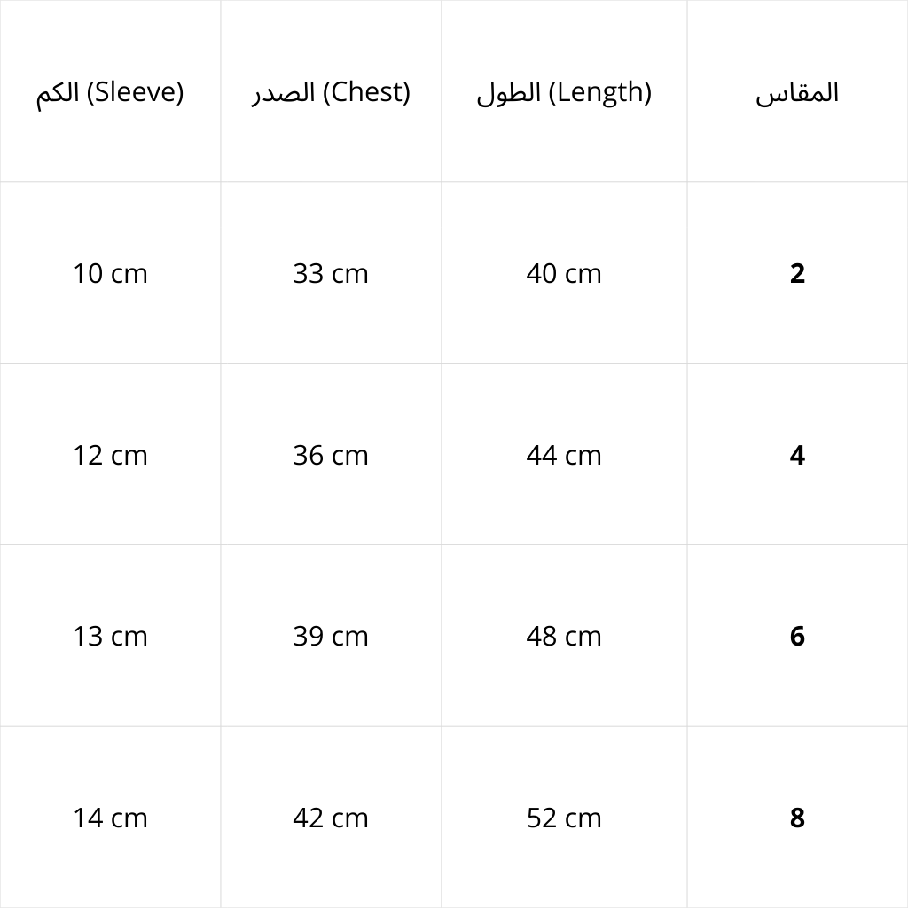 جميع المقاسات مصممة بقصة Over Size المريحة التي تمنح الطفل حرية الحركة الكاملة.